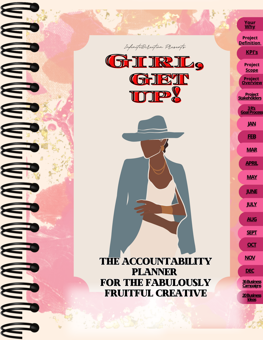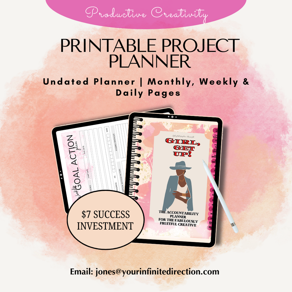 Inspired by my Girl, Get Up! Life & Times of an Infinite Dreamer Podcast, I recently created this 56-page Printable and Digital Accountability Planner, designed exclusively for the creative woman eager to turn passion into profit. This project management-style planner simplifies goal tracking and provides the structure needed to complete creative projects efficiently and successfully.